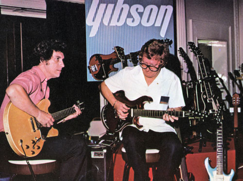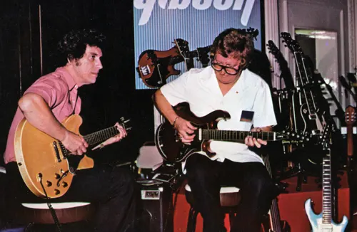 In mid 1981, Gibson awarded it's UK distribution to Rosetti. The image to the left (taken from the cover of the 1981 Rosetti gibson catalogue) shows the Rosetti trade stand at the 1981 British Music Fair - resplendent in its Victorys. Gibson market development manager Bruce Bolen plays the then-new ES-335 Dot whilst Dave Roberts is on a Victory MV-II. Note the blue MV-X with very unusual white scratchplate in the foreground, and Victory Standard bass on the back wall.