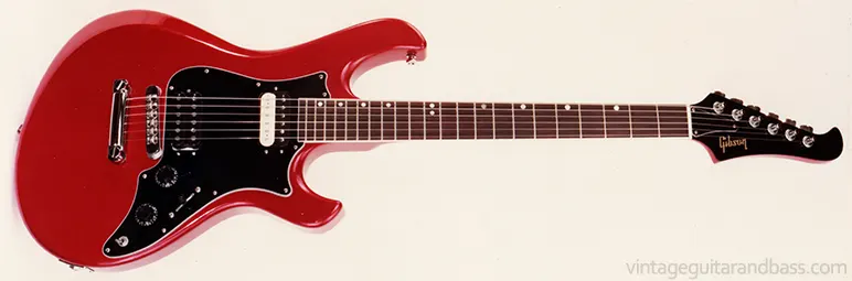 An early promotional image of the Gibson Victory MV2 in Candy Apple Red finish. Note the all-black Magna II bridge pickup