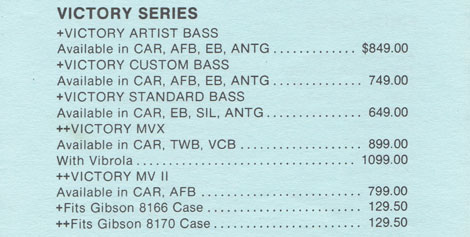 The Gibson Victory was included in pricing sheets from June 1981 until January 1984. All prices quoted are United States zone 1. See also the Gibson Victory bass pricing