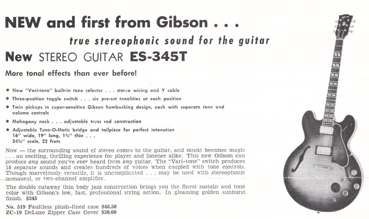 Gibson announced the ES-345T to dealers in May 1959, in the Gibson Gazette newsletter. The new stereo wiring was clearly a huge selling point; the guitar was listed alongside three Gibson stereo guitar amps.
