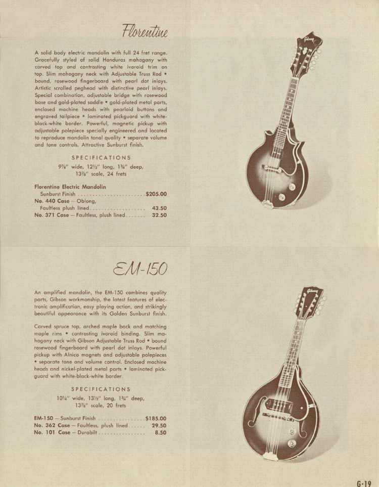 Gibson 1958 electric guitars and amplifiers catalog, page 19. This page contains the only mandolins in the 1958 catalog, both electric models. Details of the Florentine and EM-150