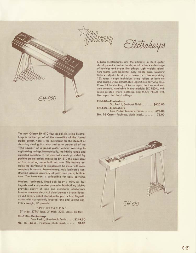 Gibson 1958 electric guitars and amplifiers catalog, page 21. Details of the Electraharps EH610, EH620 and EH-630 pedal steel guitars. 1958 zone 1 USA price EH-610: $249.50; EH-620: $620; EH-630: $520.