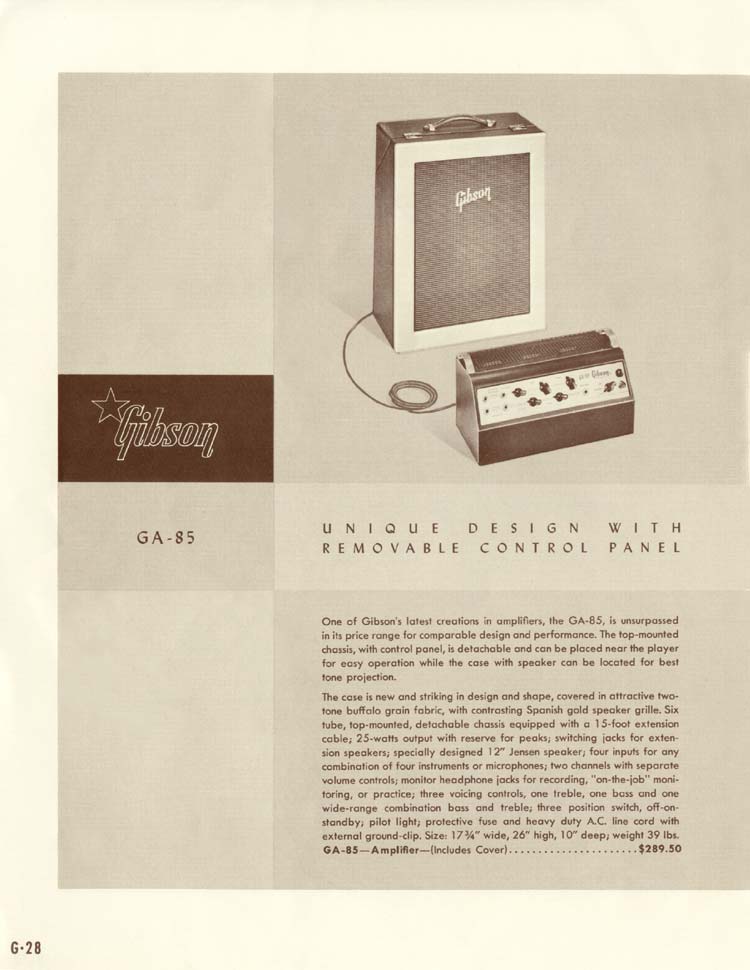 Gibson 1958 electric guitars and amplifiers catalog, page 28. Details of the GA-85 guitar amplifier. 1958 zone 1 list price was $289.50
