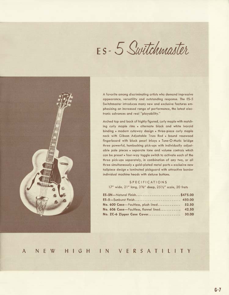 The guitar shown on this catalog page has three single-coil P90 pickups, with black plastic covers, however by the time of it's final catalog appearance in the next Gibson catalog, these had been upgraded to gold-covered PAF humbuckers. See the ES-5 in the 1960 Gibson catalogue.