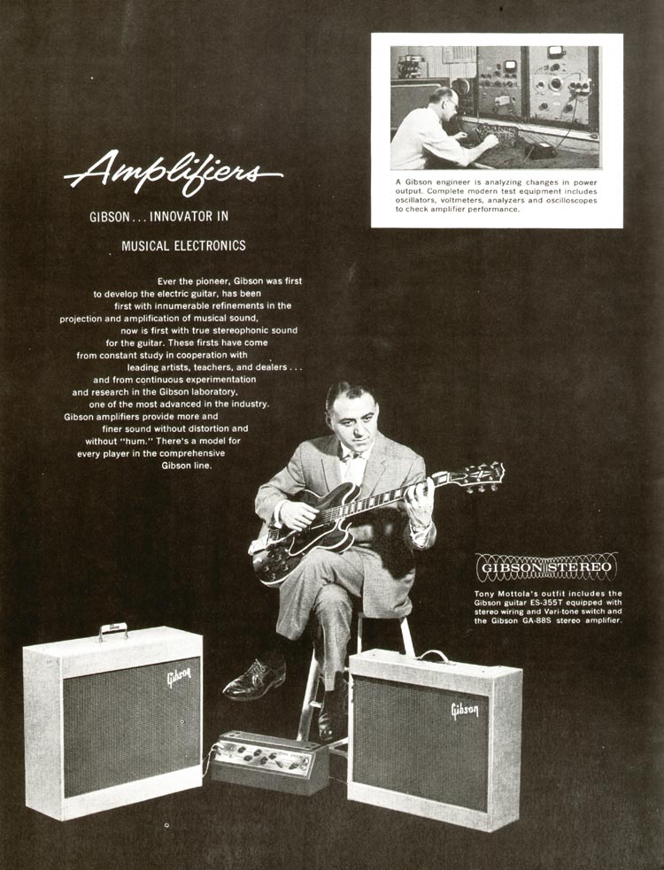 Featuring well known session musician Tony Mottola playing a Gibson ES355TD-SV. Mottola was a Gibson endorsing artist for some years in the early 1960s, being pictured with a range of different Gibson amplifiers. Here he is shown with two models, the GA-77 Vanguard and GA-88S stereo. Compare this image to the equivalent in the 1962 Gibson catalogue with just the Vanguard, or this early 1963 advertisement, using a similar image, from the same photo-shoot, but with a newer version of the Vangaurd, the Crestline series GA-77RVTL.