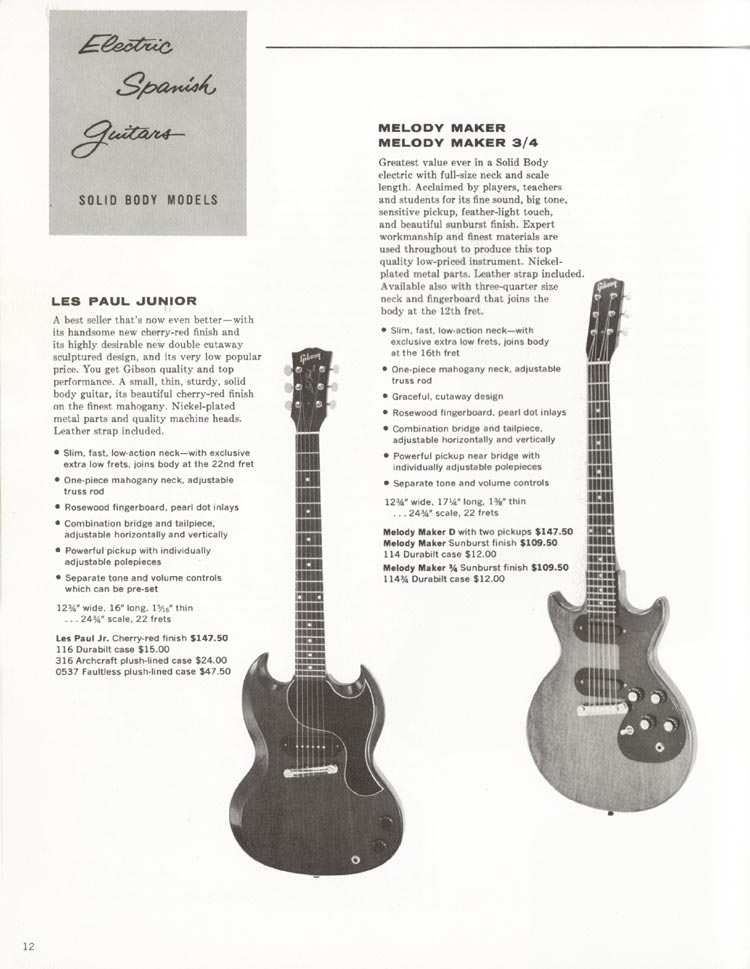 Both the Les Paul Junior and Melody Maker guitars were selling very well at this point. Like the Les Pauls, the Melody Maker had also been redesigned; when launched it had the single cutaway Les Paul shape (see the 1960 Gibson catalogue). It was available as a single pickup, double pickup (Melody Maker D), and three-quarter sized student model (Melody Maker 3/4).