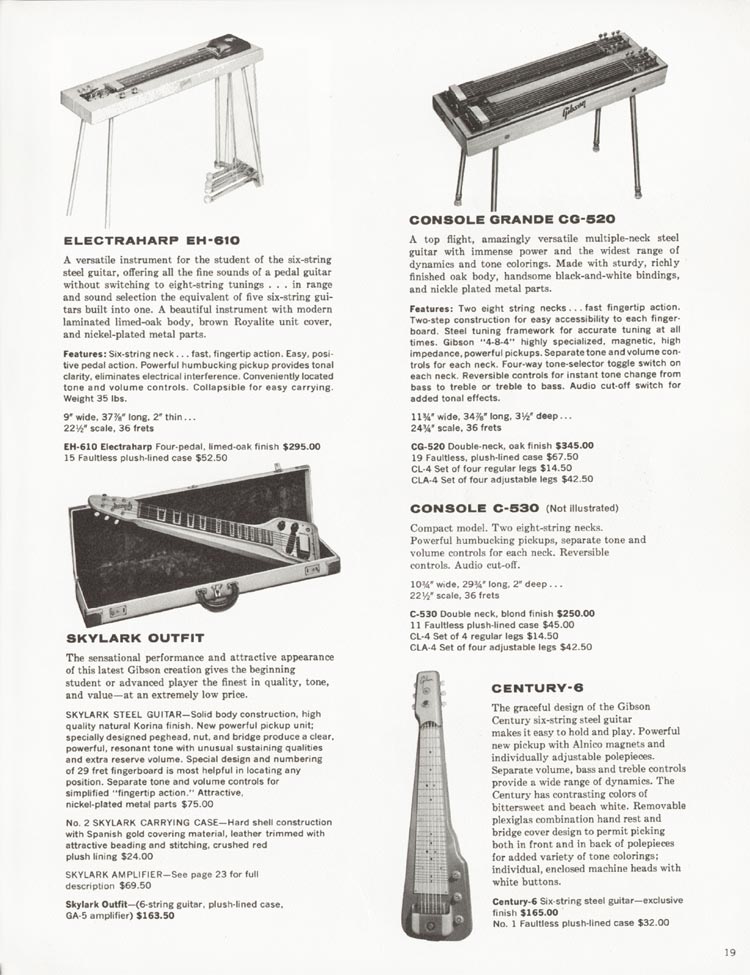 Gibson 1962 guitar and amplifier catalogue. Page 19. The electric steel guitars range continues from page 18 with details of five more models, the Electraharp EH-610, Skylark outfit, Console Grande CG-520, Console C-530 and Century-6 steel guitars.