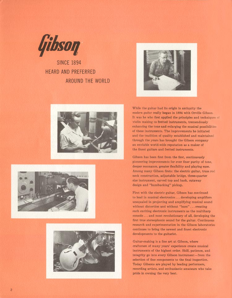 Gibson 1962 guitar and amplifier catalog. Page 2. Images of the construction of an ES-125TC. Again, the content of this page is identical (save background colour) to the equivalent page in the 1960 Gibson catalog.