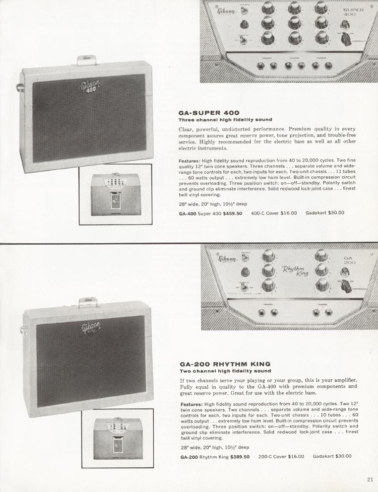 Gibson 1962 guitar and amplifier catalogue. Page 21. Gibson guitar amplifiers. The Gibson amp section starts with two of Gibson's larger guitar amplifiers of the early 1960s, both 60watt models fitted with two twelve inch speaker cones. Details of the GA-200 Rhythm King and GA-Super 400 guitar amplifiers.