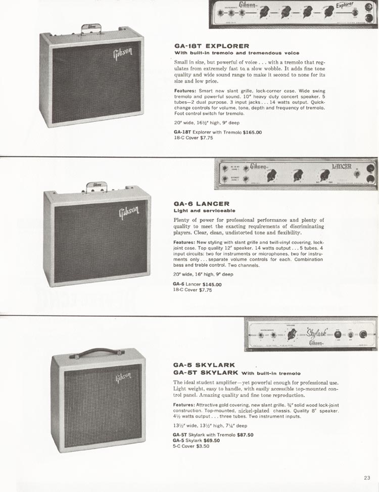 Gibson 1962 guitar and amplifier catalogue. Page 23. Gibson amplifiers. Details of the 4 1/2 watt GA-5 / GA-5T Skylark and 14 watt GA-6 Lancer and GA-18T Explorer amplifiers.