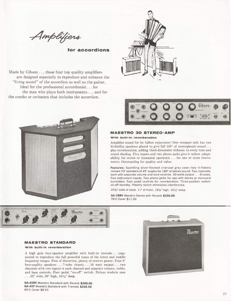 Gibson 1962 guitar and amplifier catalogue. Page 27. Gibson guitar amplifiers. Details of the GA-45T /GA-45RV and GA-78RV Maestro Stereo accordion amplifiers