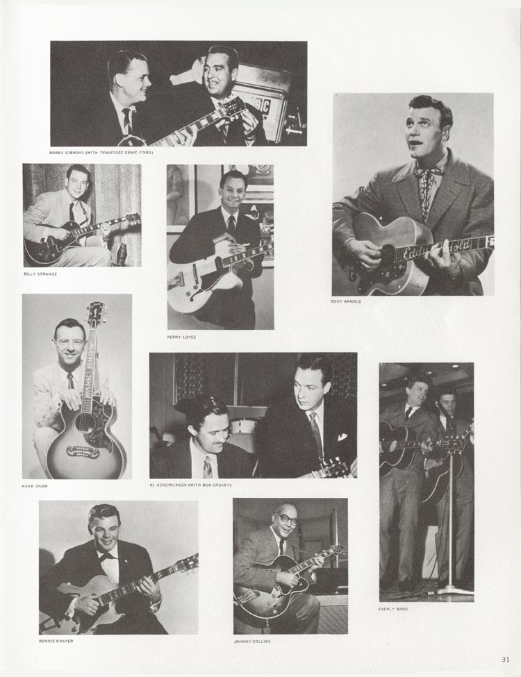 Gibson 1962 guitar and amplifier catalogue. Page 31. Gibson galaxy of stars - Bobby Gibbons, Billy Strange, Perry Lopez, Eddy Arnold, Hank Snow, Al Hendrickson, Ronnie Draper, Johnny Collins and the Everly Brothers