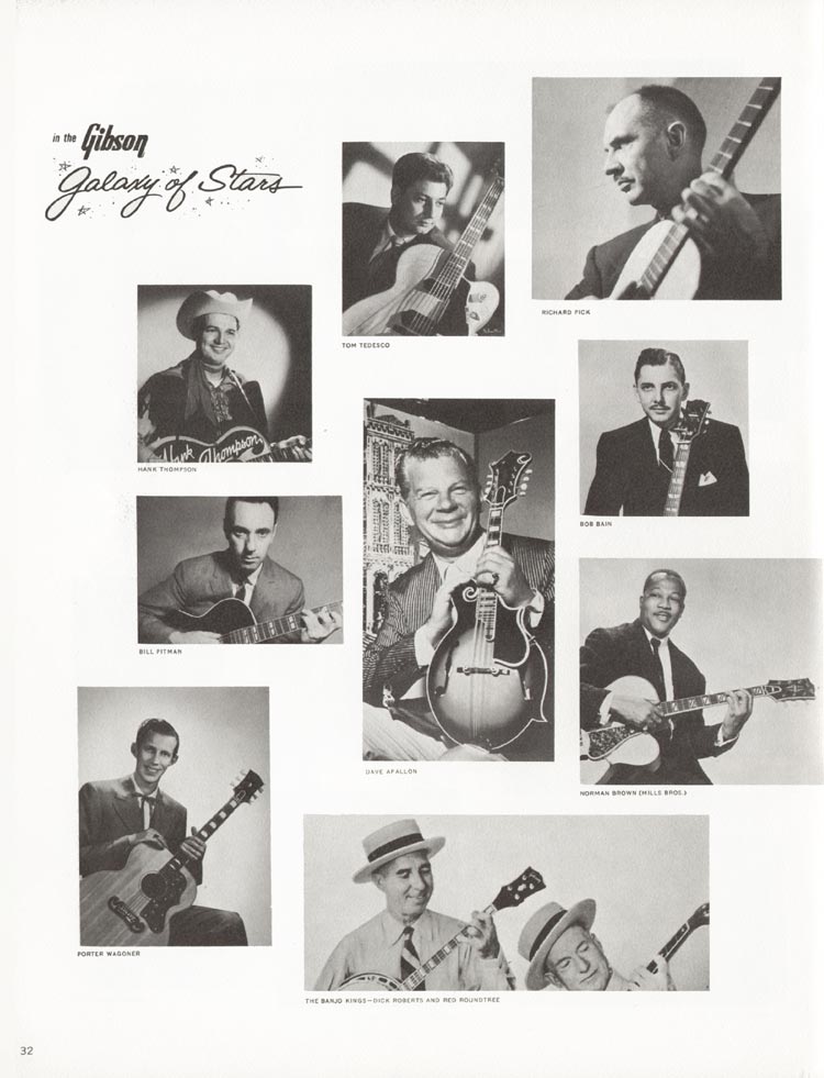 Gibson 1962 guitar and amplifier catalogue. Page 32. Gibson galaxy of stars - Hank Thompson, Tom Tedesco, Richard Pick, Bill Pitman, Dave Apallon, Bob Bain, Norman Brown, Porter Wagoner and the Banjo Kings.
