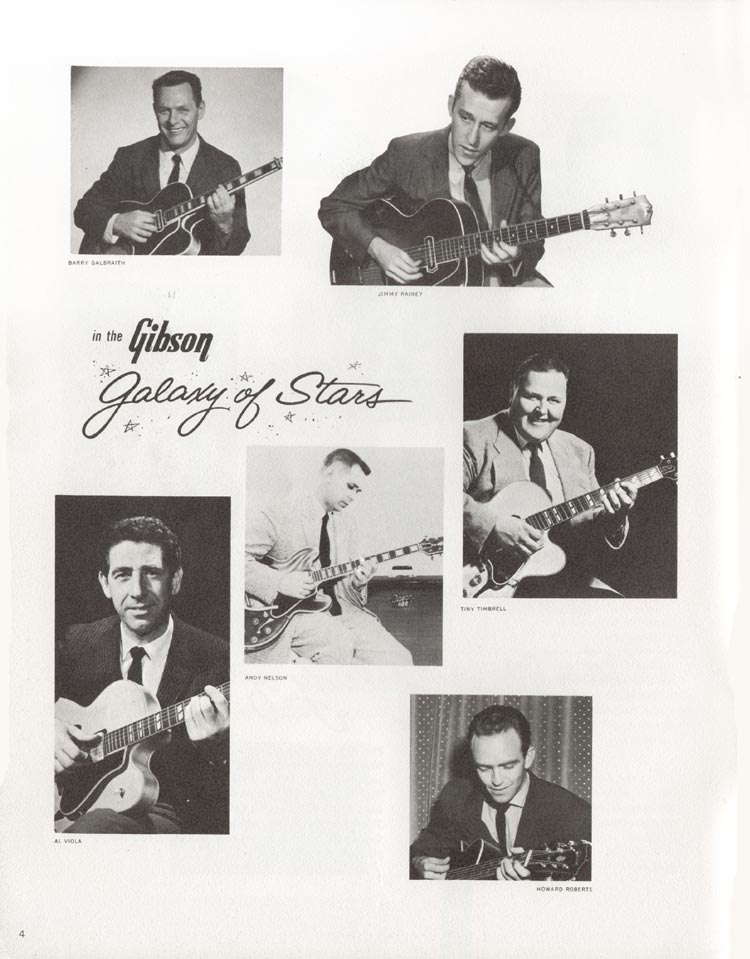 Gibson 1962 guitar and amplifier catalog. Page 4. Gibson Galaxy of Stars - Barry Galbraith, Jimmy Rainey, Al Viola, Andy Nelson, Tiny Timbrell and Howard Roberts