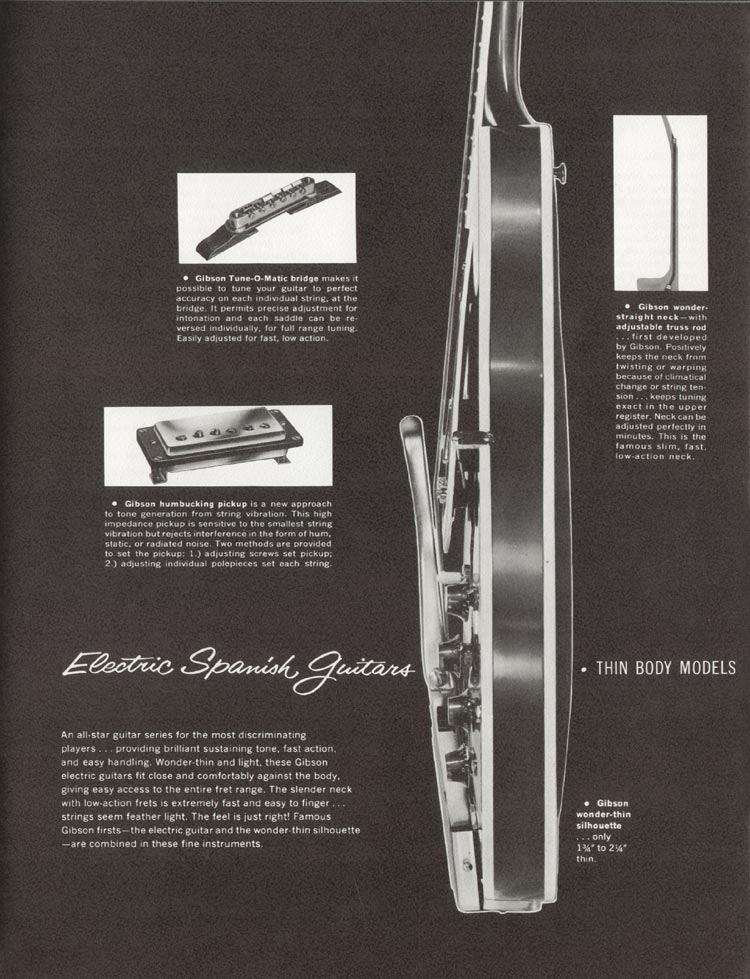 Gibson 1962 guitar and amplifier catalog. Page 5. Title page for the thinline section of the catalog covering the following four pages - details of key features: tune-O-matic bridge, humbucking pickups, adjustable truss rod - and the Gibson wonder-thin silhouette ... only 1 3/4" to 2 1/4" thin.