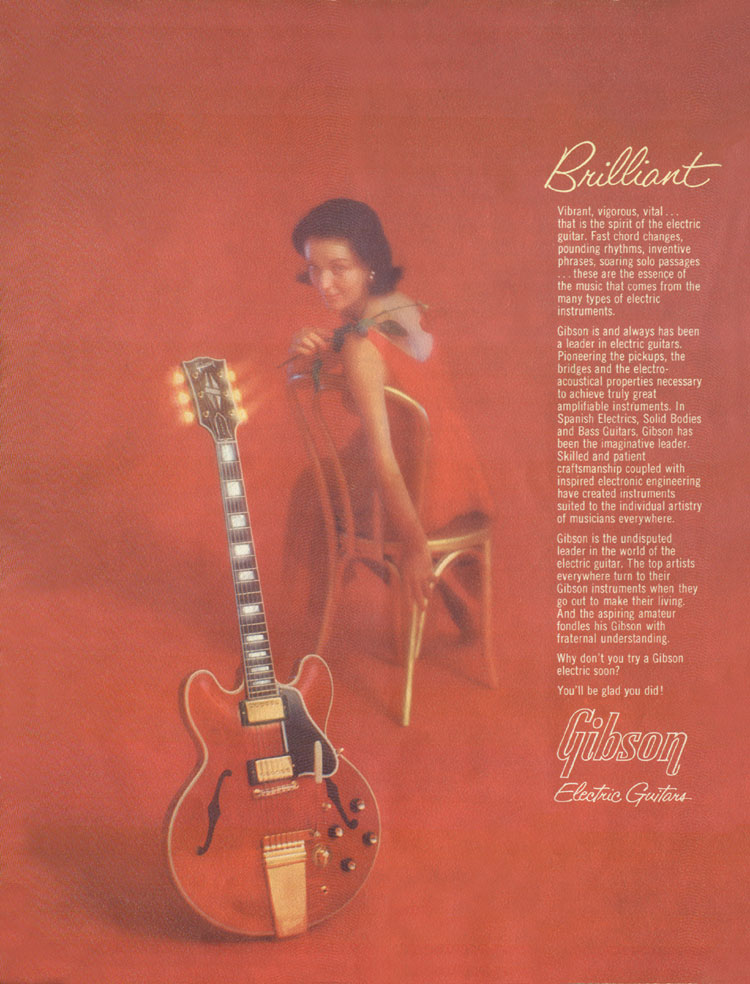 1964 Gibson Guitar and Bass Catalogue - front cover. This was Gibson's first full colour catalog cover, and it beautifully demonstrates the top of the Gibson range thinline semi-acoustic, the ES-355TD-SV.