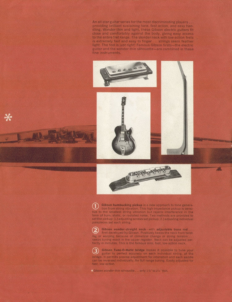 Gibson Guitar and Bass catalog, 1964. Despite the full colour front cover, the back page of this catalog is just two-colour printed, red and greyscale. The text on the back cover describes three of Gibson's innovations; the humbucking pickup, truss rod and tune-o-matic bridge - overlaid over an image showing the relative thin-ness of the the thinline series.