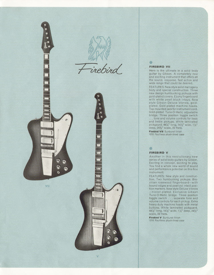 Gibson Guitar and Bass 1964 Guitar and Bass catalog. Page 9. The first page of two on the new Gibson Firebird series. It comprised four guitar models, the Gibson Firebird VII and Firebird V on this page, and the Firebirds III and I on page 10. Two bass guitars in the same series, the Thunderbird basses, are shown on page 13.
