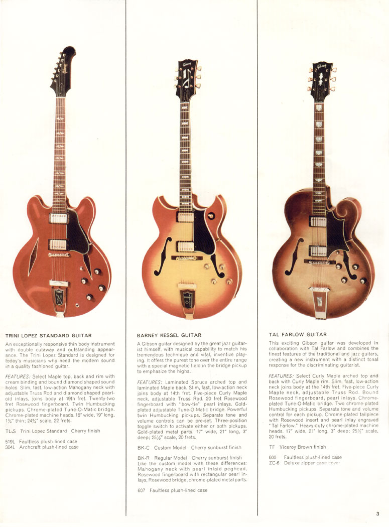 Three more Gibson Artist guitars (see the previous two guitars in the Electric Acoustic Artist series on the previous page), again all hollowbody jazz models: the Trini Lopez Standard with it's diamond soundholes, Tal Farlow with it's unique scroll on the lower bout and Barney Kessel with it's distinctive sharp cutaways. This was the first catalog inclusion of the Trini Lopez models.