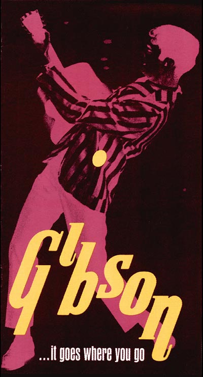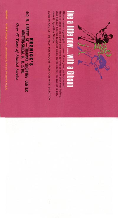 This 1968 Gibson guitar pamphlet was fairly concise - at just eight sides and measuring roughly 5" x 9" it only contained a small sample of Gibson's range: four pages of guitars, and two pages of guitar amplifiers. It was vibrantly coloured however, and quite a good synopsis of the companies entry-intermediate level products.