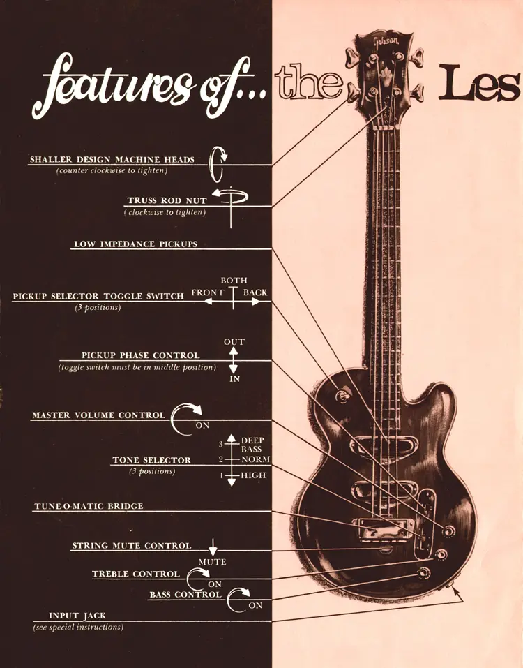 1969 owners manual for the Gibson Les Paul bass. Page 2-3 are a double page spread entitled 'features of the Les Paul Bass guitar'. This side labels all the parts of this bass, with descriptions appearing on page 3. Again an odd-looking (and slightly out of scale) image is used for this page - hardly a good advert for the instrument.