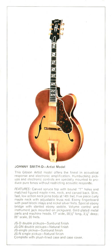 Gibson 1970 Electric Acoustics catalogue, page 3. Details of the Gibson Johnny Smith electric acoustic guitar; a very fine archtop hollow-body guitar, developed by Gibson with the help of jazz guitarist Johnny Smith.