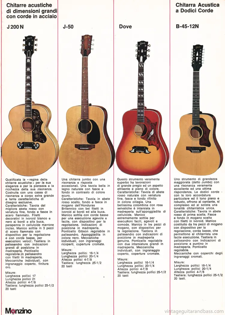 This catalog shows just a small portion of the Gibson acoustic guitar range of 1971: the Gibson J-200N, J-50, Dove and twelve string B45-12N.