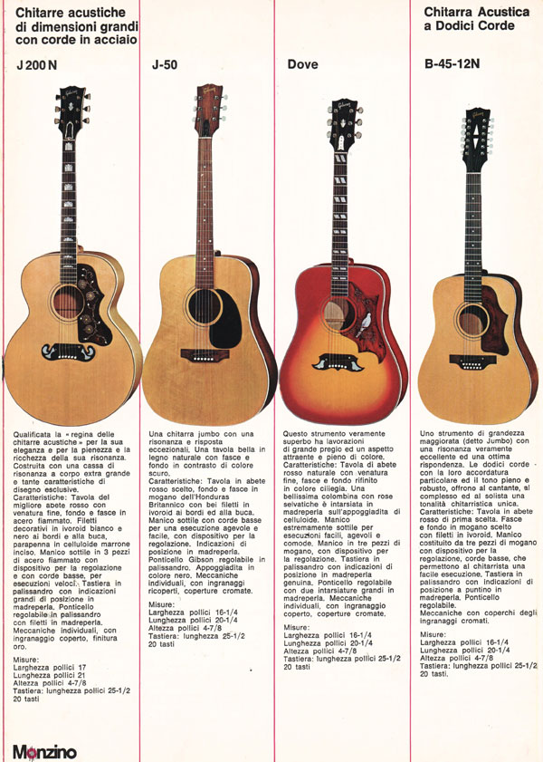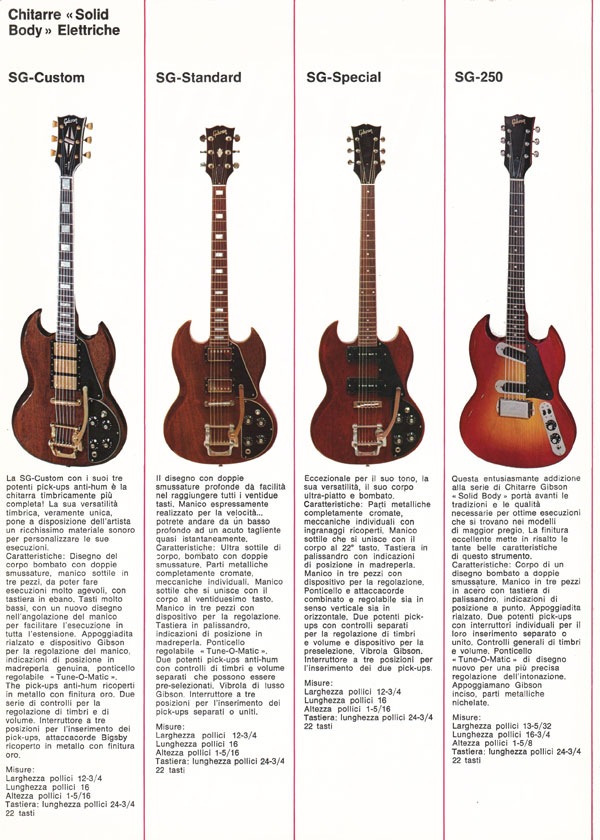 But by 1971, Norlin had made an agreement with Italian music company Monzino for the distribution of Gibson guitars. This, their first catalog, was produced sometime between mid and late 1971, and shared the same cover image as the US Low Impedance for High Performance brochure of the same year. It featured fourteen guitars and five basses; most had previously appeared in the American 1970 Gibson catalogues or the Low Impedance brochure. But there were some (the redesigned SG series) that would not be seen in a Gibson catalog until 1972 (see the 1972 Gibson solid bodies catalogue). In fact these were then renamed, (SG Standard became the SG Deluxe, and the SG Special became the SG Pro) - although they keep their usual Standard and Special designation here. One instrument, however, is unique to this catalogue; the SB400 bass was not around for the 1970 Gibson bass catalogue, and superseded (by the SB450) by the time of the 1972 bass place catalogue. Perhaps it was only just available, as the catalog image here (unless an artifact of the photograph) seems to show a bass with brass (still to be chromed) hardware.