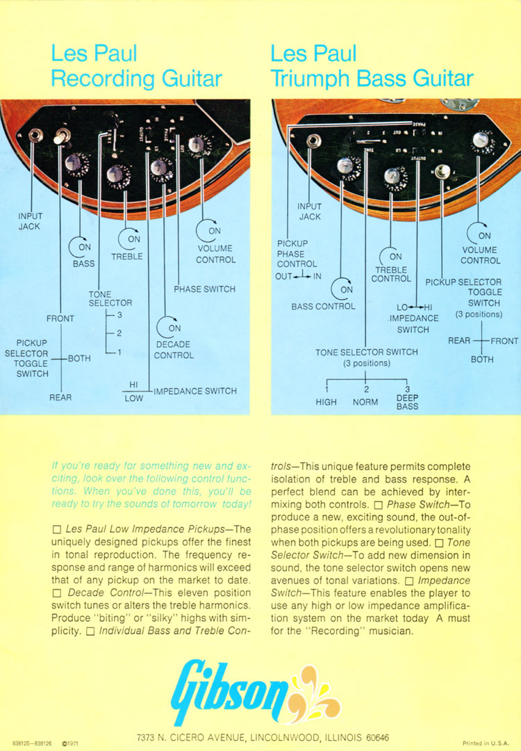 For a more in-depth examination of the Les Paul Recording and Triumph bass controls, see the 1971 owners manuals released at the same time as this brochure: LP Recording manual, LP Triumph manual