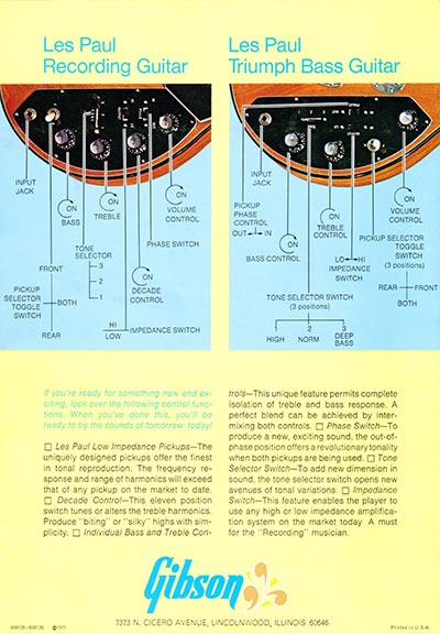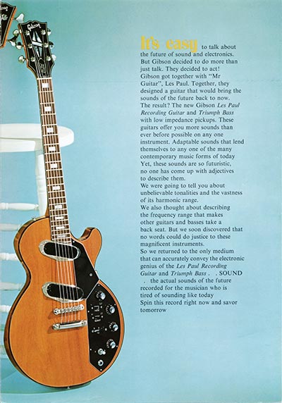 1971 saw the launch of two new Gibson low impedance instruments: the Les Paul Recording guitar, and the Les Paul Triumph bass - both based on two 1969 models the Les Paul Personal and Professional, and the Les Paul Bass.