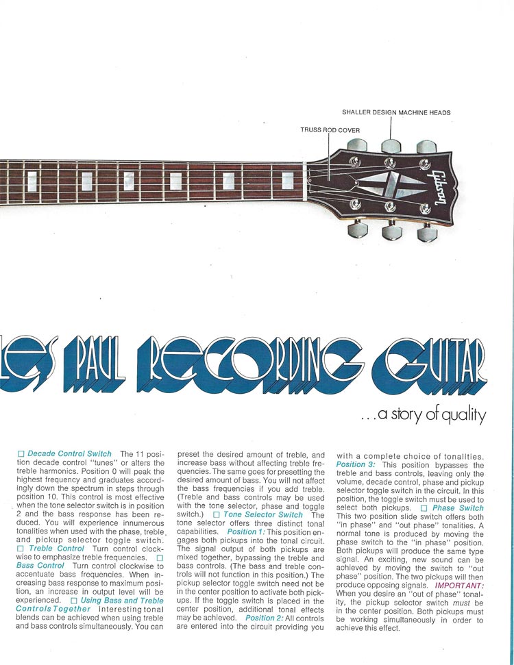 The descriptions of the controls of the Les Paul Recording guitar continue from page 2. In particular this page describes the functionality of the Treble, Bass and Decade controls.