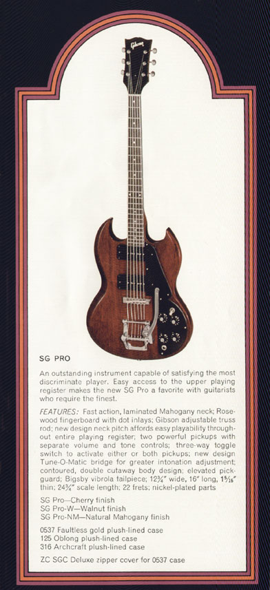 Gibson 1972 solidbody catalog. Page 5. Details of the Gibson SG Pro. The SG Pro was announced in June of 1971, and manufactured between mid 1971 and mid 1972. In many ways it was a renamed and redesigned SG Special which was dropped at the same time. Like the Special it came equipped with two P90s, and vibrola, but it also adopted some of the changes that were being introduced in many other Gibsons at the time; smaller raised pickguard (rather than full face), surrounds on humbuckers, Bigsby (rather than Maestro) vibrola, and front-routed control panel. It did get a bridge with individually intonatable saddles for the first time. Examine the 1970 Gibson SG Special for comparison.