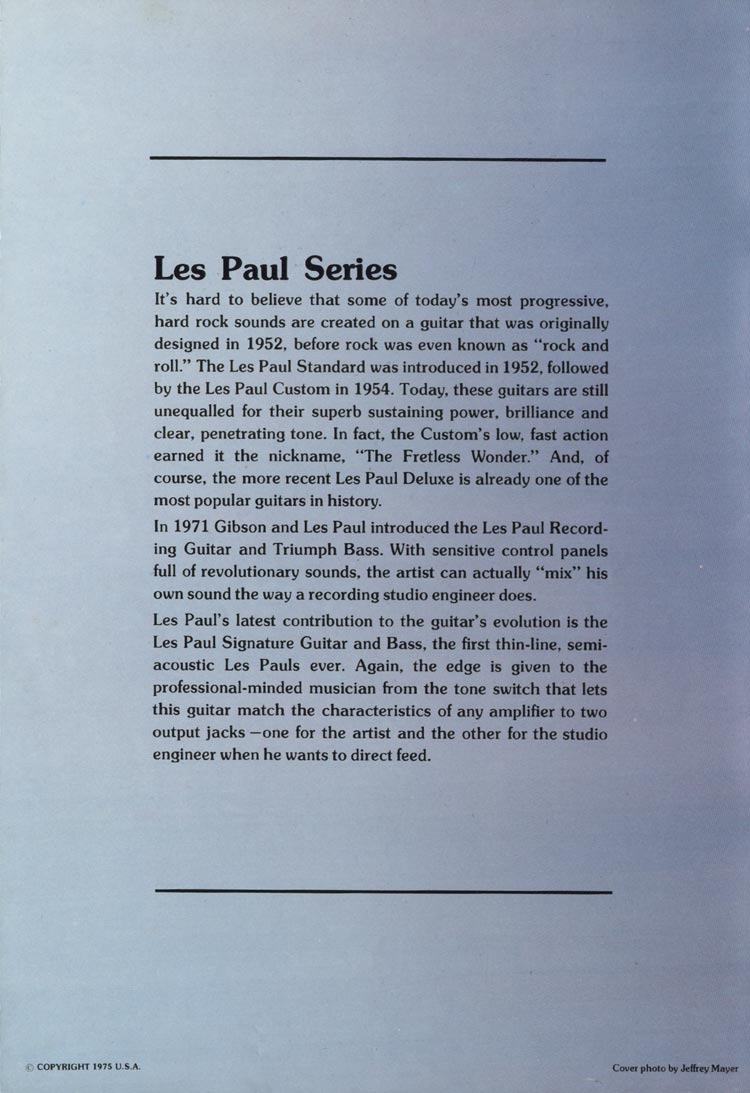 Introduction to the 1975 Les Paul catalog, summarising the history of the Les Paul guitar and highlighting some of the most recent innovations in the Les Paul range.