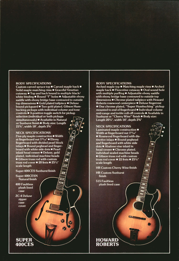Gibson 1975 Custom Order & Electric Acoustics catalogue. Page 10. Details of two electric acoustic guitars: one well-established model, the Gibson Super 400CES and one relatively new guitar, the Howard Roberts Custom, launched in 1973. The Super 400 CES was also available as a purely acoustic guitar, the Super 400, seen on page 6 of this catalogue. The Howard Roberts Custom was solely available as an electric acoustic.
