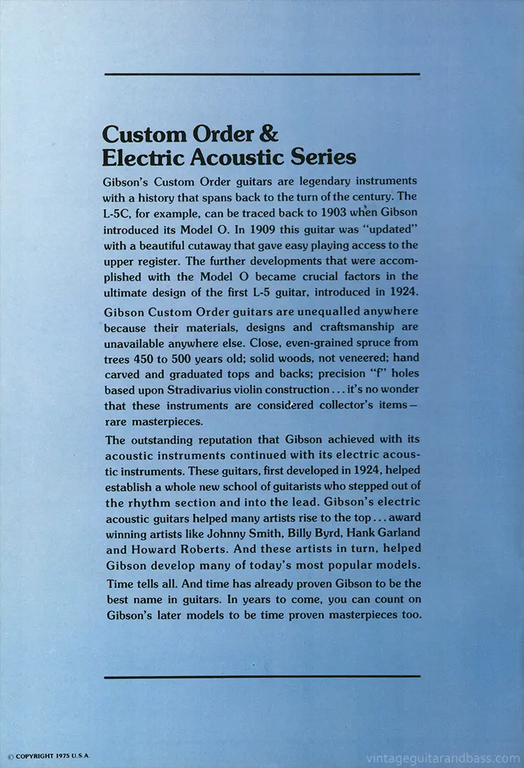Gibson 1975 Custom Order & Electric Acoustics catalogue. Page 2. This page highlights some of the features that make very high end Gibson guitars the very best guitars available.