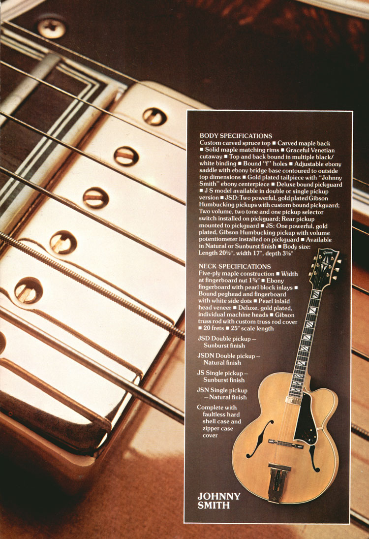 Gibson 1975 Custom Order & Electric Acoustics catalogue. Page 9. The second page on a double page spread on the Gibson Johnny Smith electric acoustic guitar. The Johnny Smith was available as a single or dual pickup instrument, and with Sunburst or Natural (as pictured here) finish. All variants were fitted with gold plated hardware. Note that this is one of the last US catalogues that describes the guitar with it's full name 'Johnny Smith' - later the model name would be shortened to the JS, or JSD for the two pickup version (actually both names are used in the 1983 catalogue), with the 'Johnny Smith' tailpiece replaced by the Gibson 'instant adjustment' jazz tailpiece. Compare with the example pictured in the 1978 Gibson Quality / Prestige / Innovation catalogue.