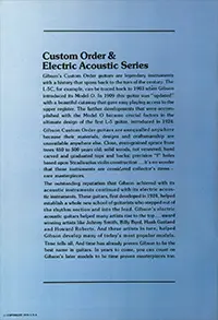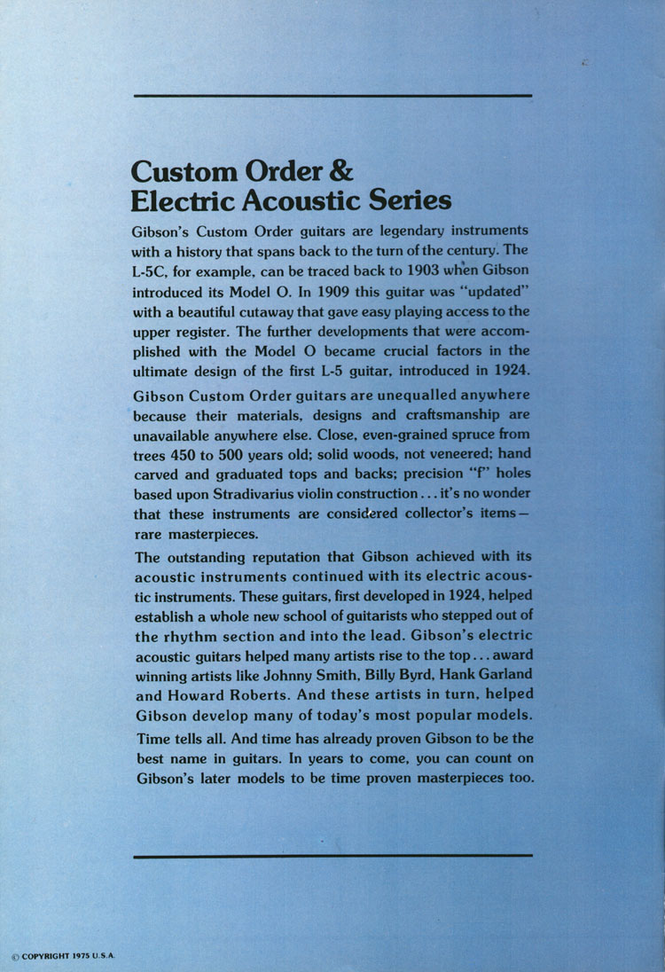 Gibson custom order and electric acoustics catalogue, like the others in the series, was prepared in late 1974 for use throughout 1975. A twelve page brochure measuring 7 1/2" x 11", and printed in full-colour throughout.