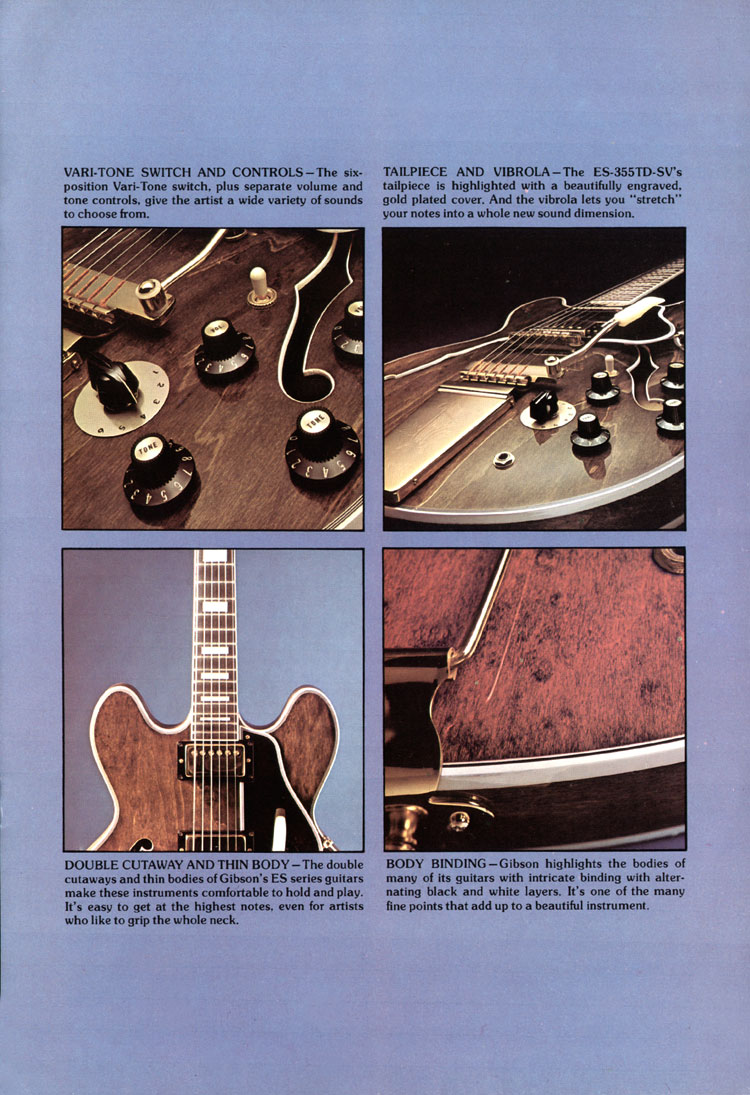 But by 1975, the thinline range had been slimmed-down somewhat; the 1970 thinline brochure) had contained ten models, compared to just four in 1975. The Gibson ES-335TD, Gibson ES-345TD, and Gibson ES-355TDSV were common to both catalogues, with the Gibson ES-325TD, being one new model not previously shown.