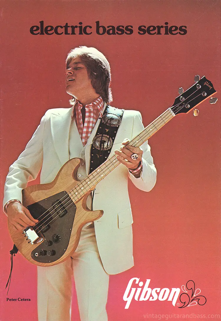 Gibson 1976 bass catalog. The front cover artist is Peter Cetera of Chicago with the Gibson Ripper bass. This is a reprint of the 1975 bass catalog, updated and expanded a year later. Although some pages elsewhere in the catalog are updated from the 1975 print, this page is identical to the 1975 cover.