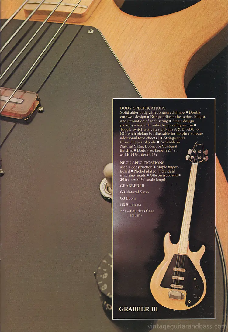 This catalog is a reprint of the 1975 'Electric Bass Series' catalog, updated and expanded a year later, specifically to include these pages on the new Gibson G-3 bass (or Grabber III as it is called here).