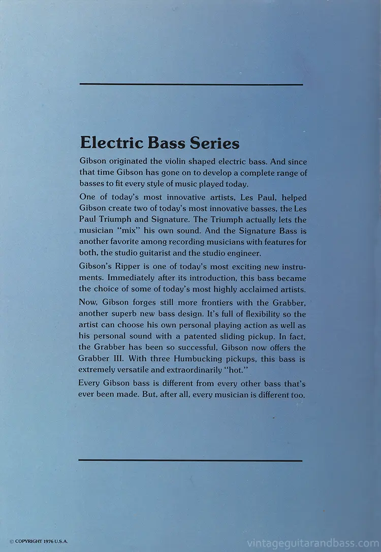 Gibson 1976 bass catalog, page 2. Introduction to the 1976 bass catalog. This page (dated 1976) is an updated version of the equivalent page of the 1975 catalog, expanded to describe the Gibson G-3 bass.