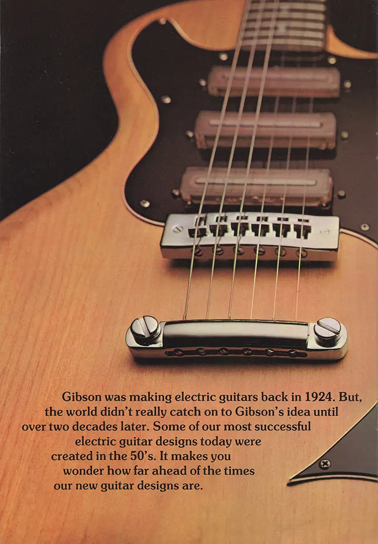 1976 Gibson solid body catalog. Page 10. The 1976 catalog was an updated version of the 1975 catalog, with changes made to pages 10-12 only. Page 10 is a left hand page of a two-page spread on the new Gibson S-1. This was the first catalog appearance of the Gibson S-1.