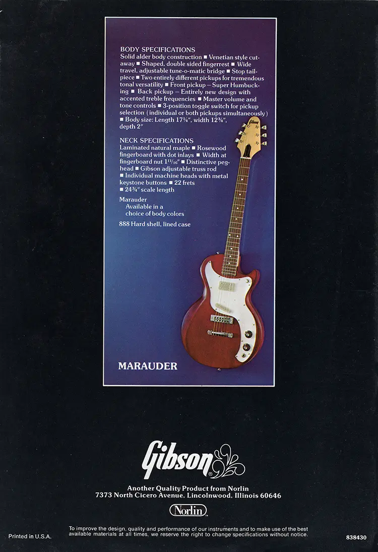 1975 Gibson solid body catalog. The 1976 catalog was an updated version of the 1975 catalog, with changes made to pages 10-12 only. In the 1975 edition, the Gibson Marauder occupied both pages 10 and 11, however the 1976 edition filled these pages with the new Gibson S-1, pushing the Marauder to the back cover as shown here. The text and guitar image are otherwise unchanged.