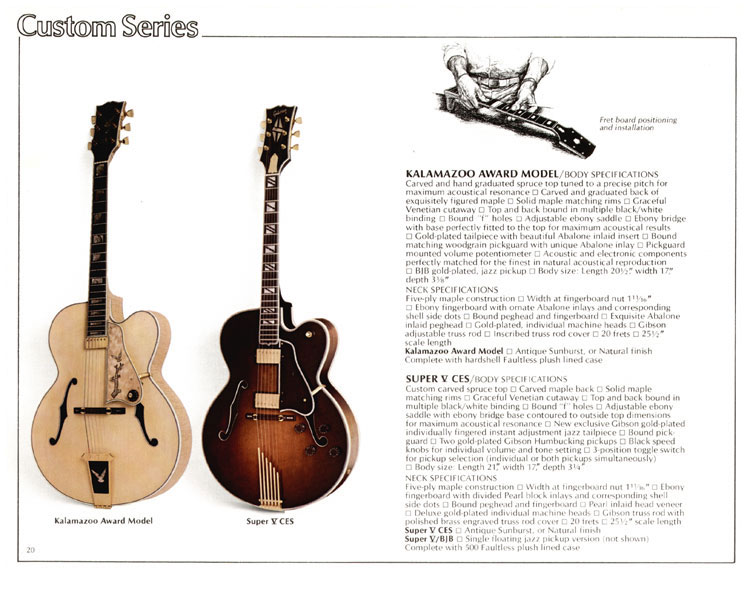 1978 Gibson Quality / Prestige / Innovation catalog, page 20. This page details two brand new models for late 1978, the exceptionally fine Kalamazoo Award Model and the Super V CES. The Kalamazoo Award was highly ornate, with a carved spruce top, abalone inlays and gold-plated hardware. In January 1979 it had a list price of $2849... making the also very very fine Super V CES seem cheap by comparison at $1899. Like some other very special models (the Johnny Smith, for example) the Kalamazoo Award has a floating pickup attached to the base of the neck rather than the guitars top - as not to interfere with the natural vibrations of the top when played. This was the first of only two catalog appearances - it took pride of place as the first model listed in the 1980 Gibson Guitars brochure.