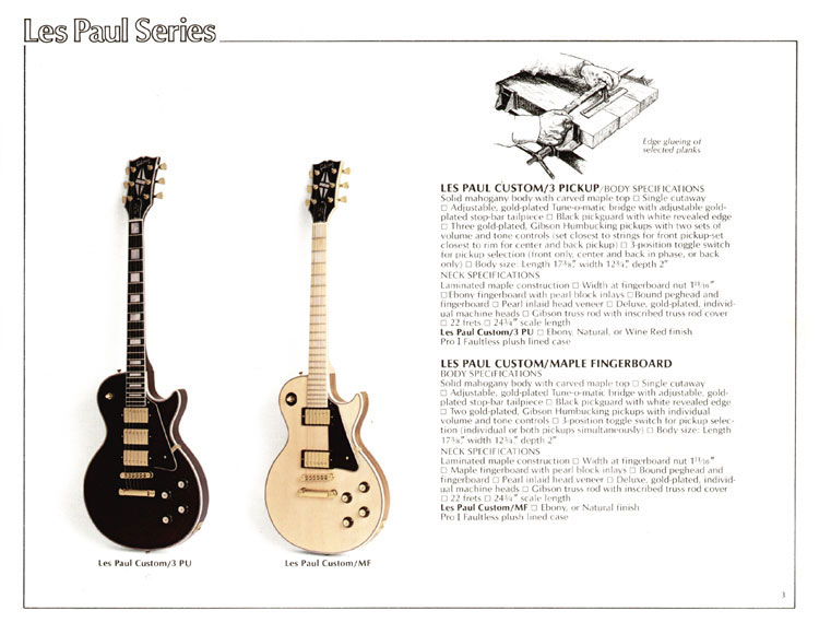 In previous years, only one Les Paul Custom was listed, however in 1978, Three separate customs were shown (two on this page, one on page 4. There was the regular two pickup Custom (available with gold or, for the first time nickel, parts), the fifties-style three pickup, which had been available in the early seventies by special order, but was available here as standard (though only shipped 106 in 1978), and the new maple fingerboard version which had been available from 1977 (only shipped 250 in 1978).