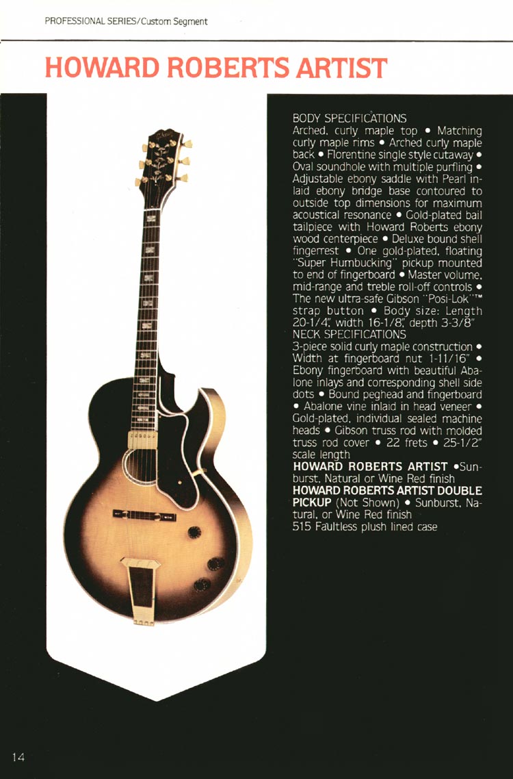 Gibson 1980 guitar and bass catalog. Page 14. Details of the Gibson Howard Roberts Artist. In the 1960s just one guitar in this series was available; the Epiphone Howard Roberts, but by this time their were three versions: the Artist, the Custom, and the Fusion.