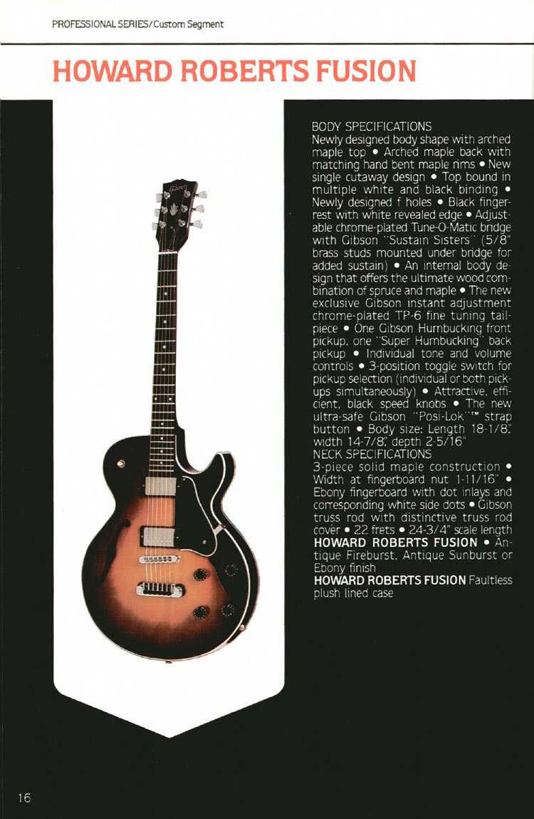 Gibson 1980 guitar and bass catalog. Page 16. Details of the Gibson Howard Roberts Fusion. The Fusion was quite different from the original Epiphone Howard Roberts, and the newer Gibson HR Artist, and Custom guitars. Most notably it lacked the soundhole (having f-holes instead), but was also thinner, with a shorter scale (24 3/4" as opposed to 25 1/2") and available in several different finishes: still Antique Sunburst, but also Antique Fireburst and Ebony.