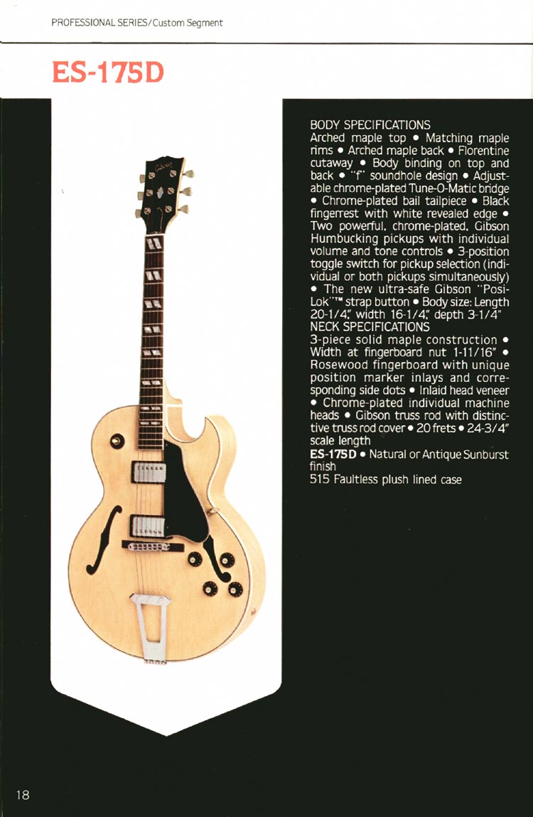Gibson 1980 guitar and bass catalog. Page 18. Details of the Gibson ES-175D; one of Gibsons best known, and most respected jazz guitars. This was the two humbucker model - as opposed to the single-pickup Charlie Christian ES-175/CC, also available at this time, and shown on the previous page.