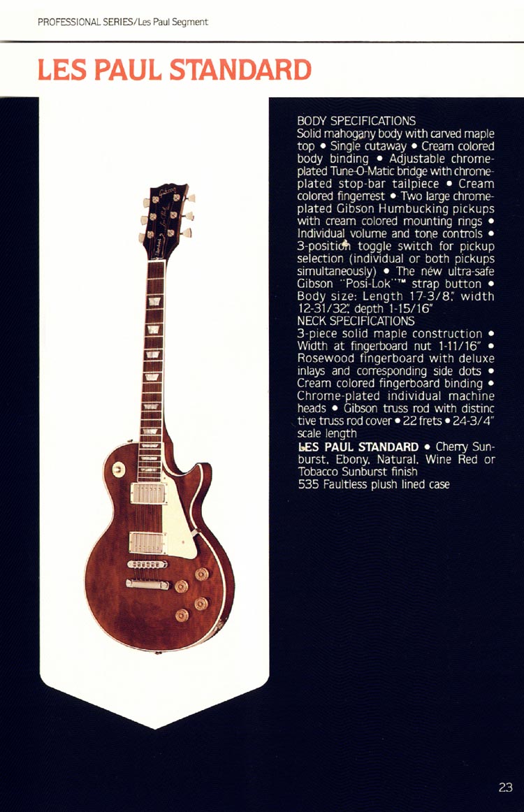 Page 23 details the Gibson Les Paul Standard. At this point, the Les Paul Standard is still fitted with a three-piece maple neck. Available finishes were: Cherry Sunburst, Ebony, Natural, Wine Red or Tobacco Sunburst.