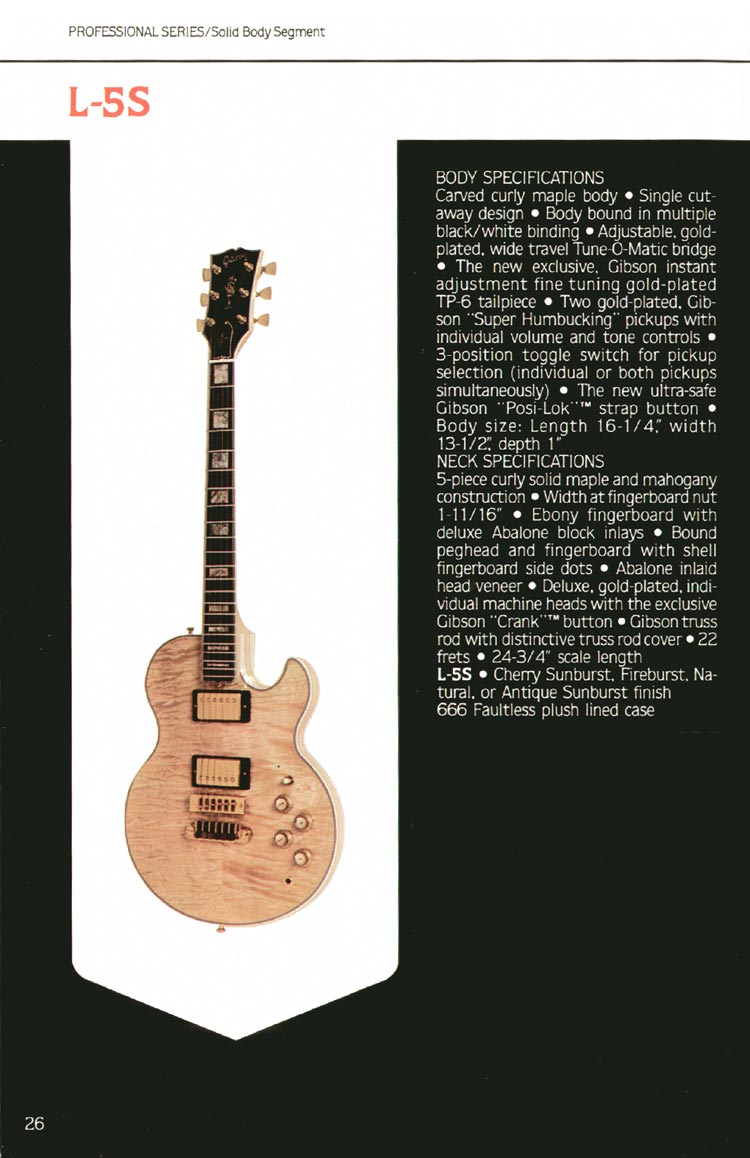 Gibson 1980 guitar and bass catalog. Page 26. Details of the L-5S. The L-5S was a very fine guitar indeed, well-made and highly appointed. Naturally it was on the higher end of the gibson price scale, with a 1980 list price (US, July 1st 1980) of $1249.